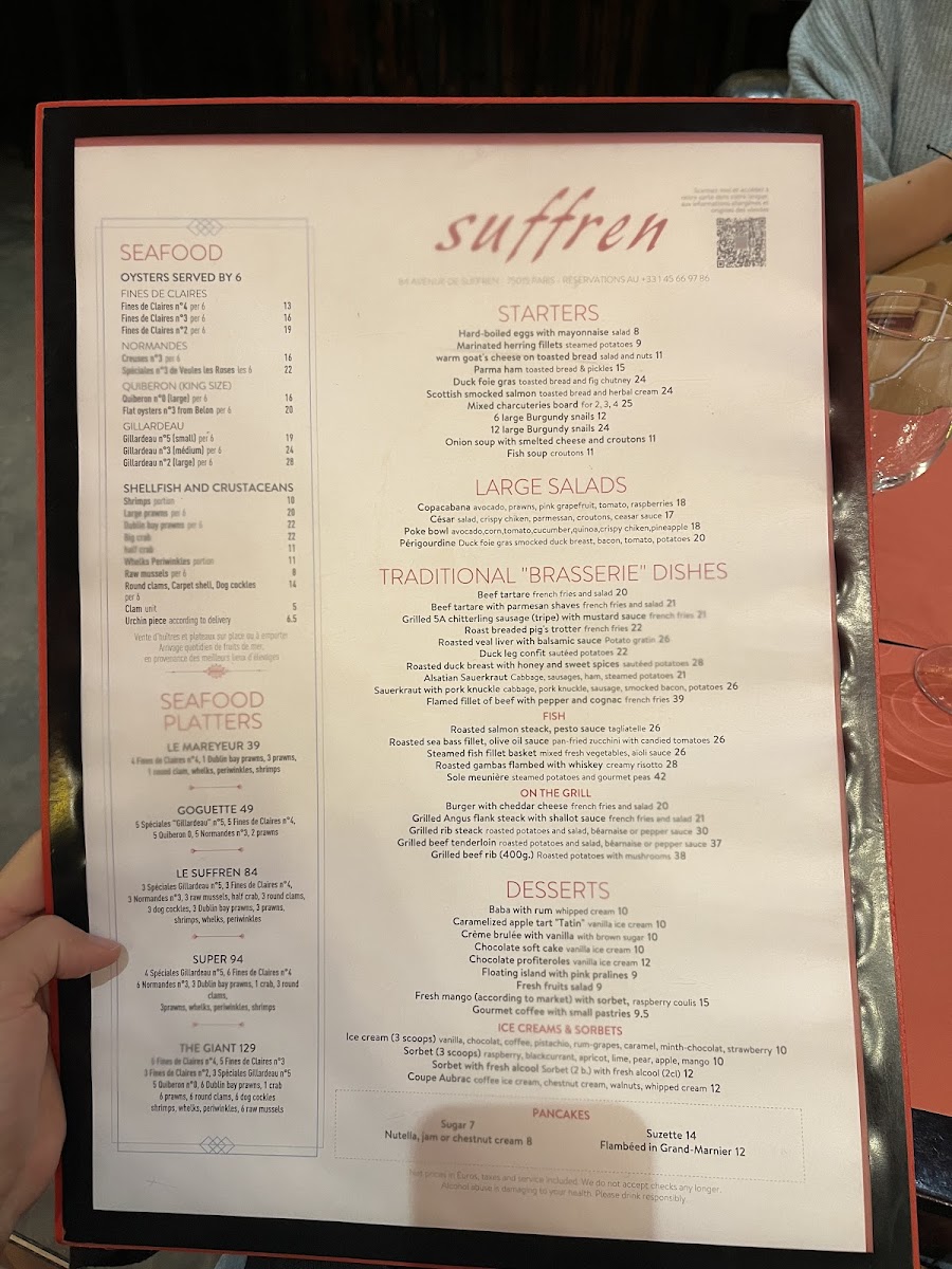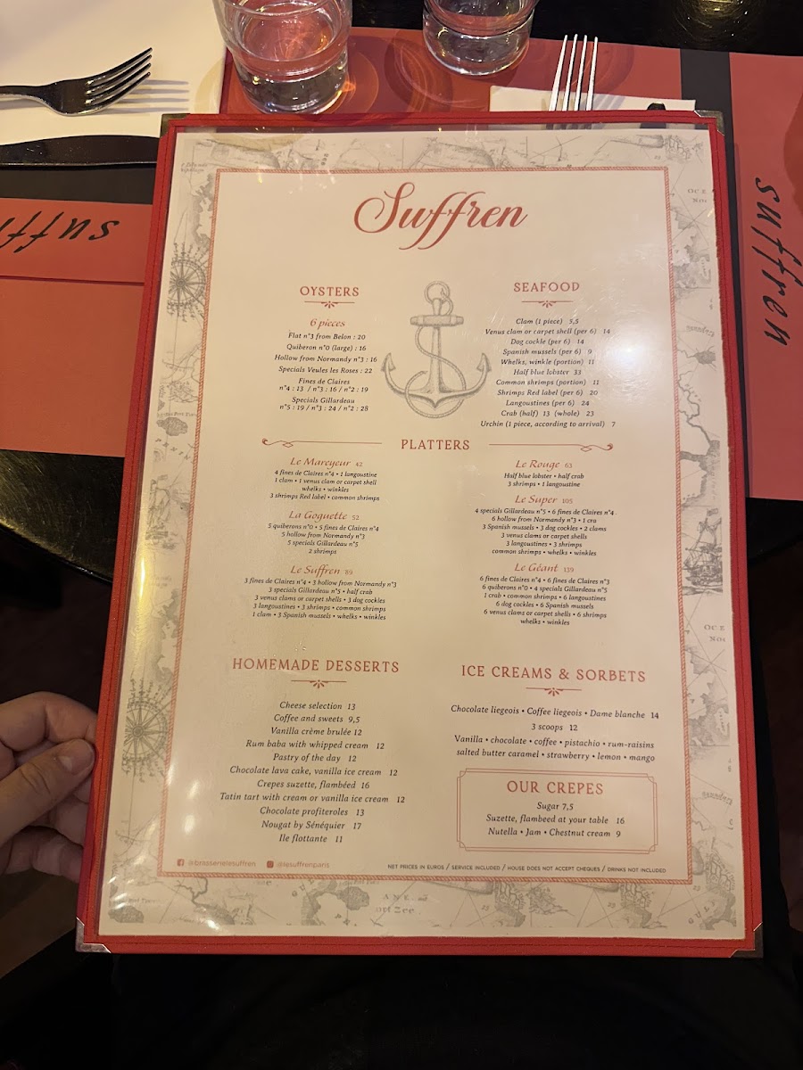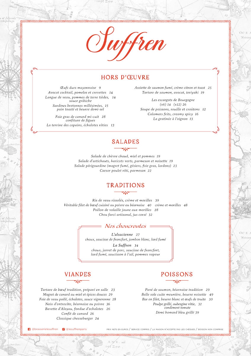 The menu at Le Suffren features a selection of classic French dishes with an emphasis on seafood and traditional brasserie fare. It is organized into distinct sections to guide diners through a range of options, from hearty main courses to fresh seafood platters and desserts.